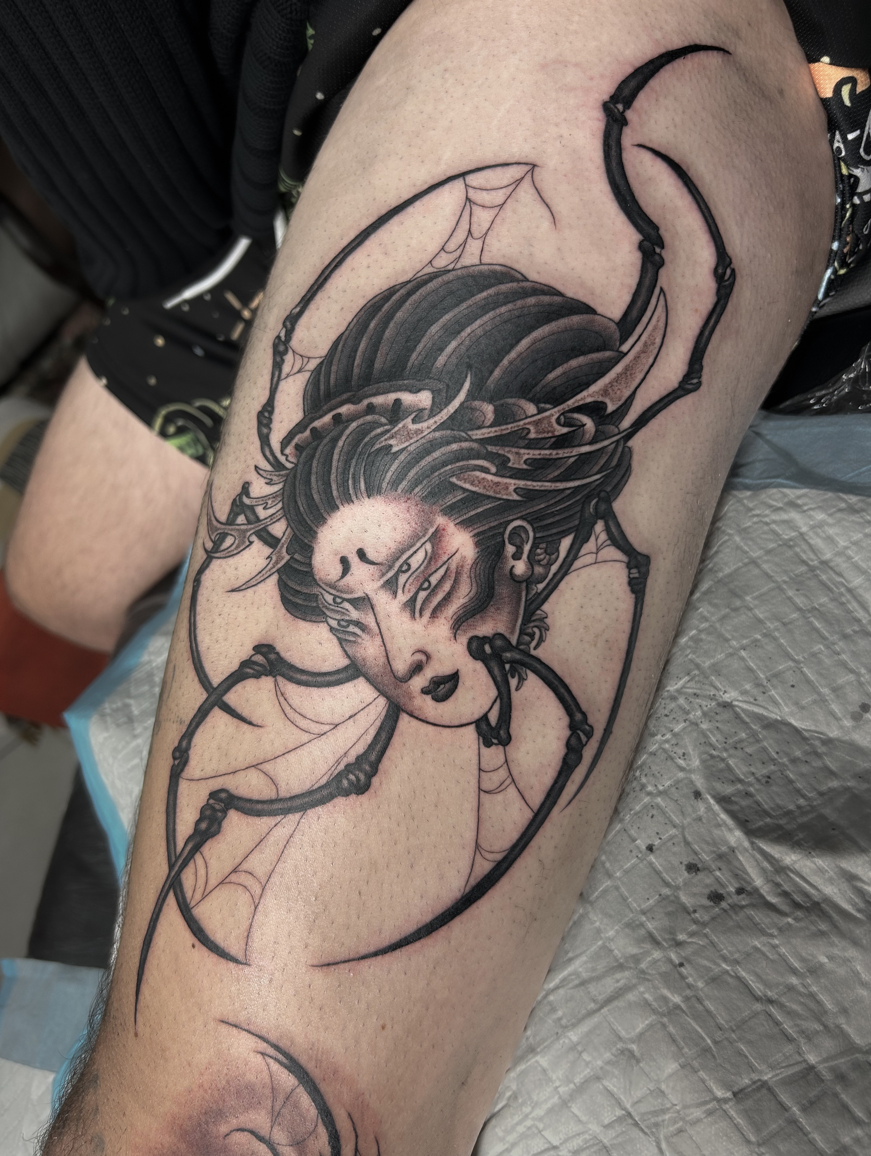 Alongside bold colour work, he’s increasingly drawn to more detailed pieces, particularly linework tattoos and black and grey designs. These styles allow him to focus on contrast, texture, and subtle detail, bringing depth and refinement to his work.